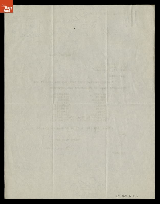 Letter from Thomas Edison to Edsel Ford regarding Names to Engrave on Ford Engineering Laboratory, May 27, 1924