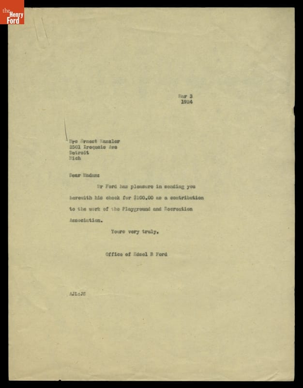 Early 20th-century reformers created the Playground and Recreation Association of America to establish clean, safe, supervised play spaces for children living in crowded cities. Reformers hoped these playgrounds would promote a sense of physical, social, and moral well-being among America's children and youth. Edsel Ford donated to this worthwhile cause throughout the 1920s and 30s.