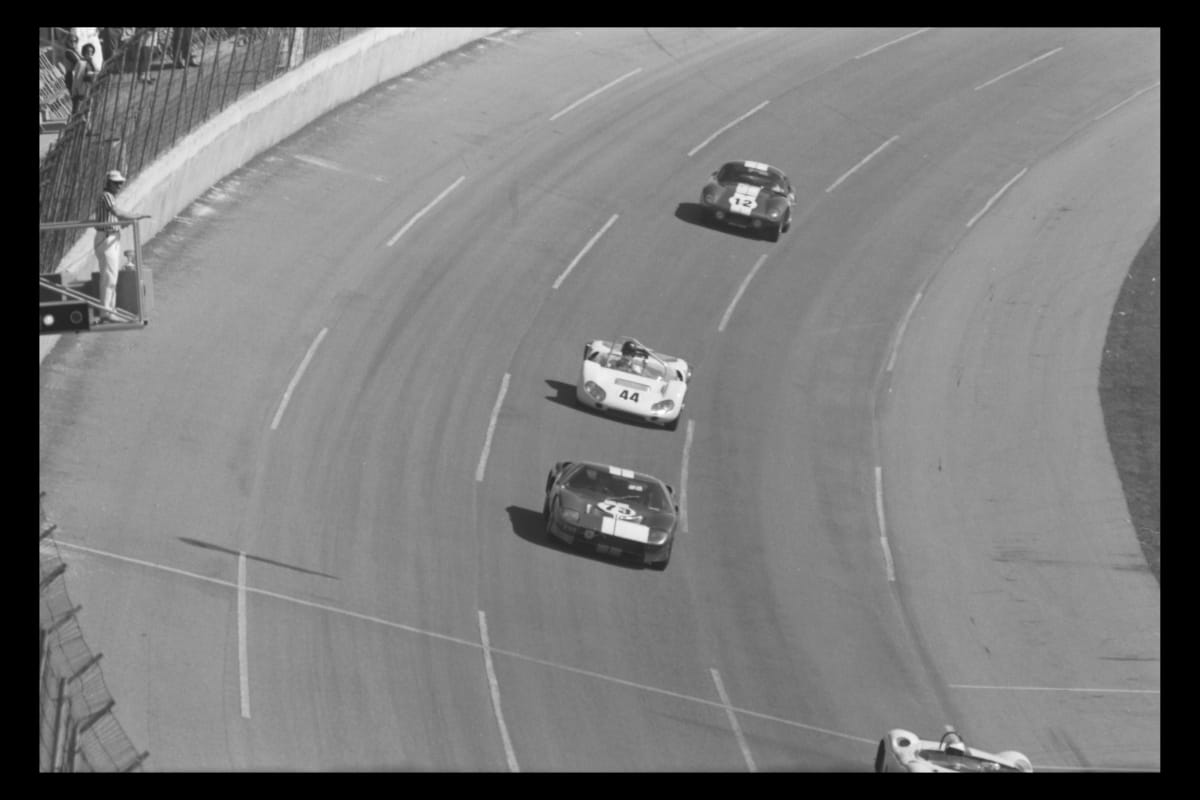 Dave Friedman captured and preserved auto racing history through his photography. His work -- and his collection of works by other photographers -- documents key races, vehicles, drivers, and teams. Forty-three cars started the Daytona Continental 2000-Kilometer, the longest race in the United States in 1965. Carroll Shelby's Shelby American racing team dominated, taking five of the top six positions.