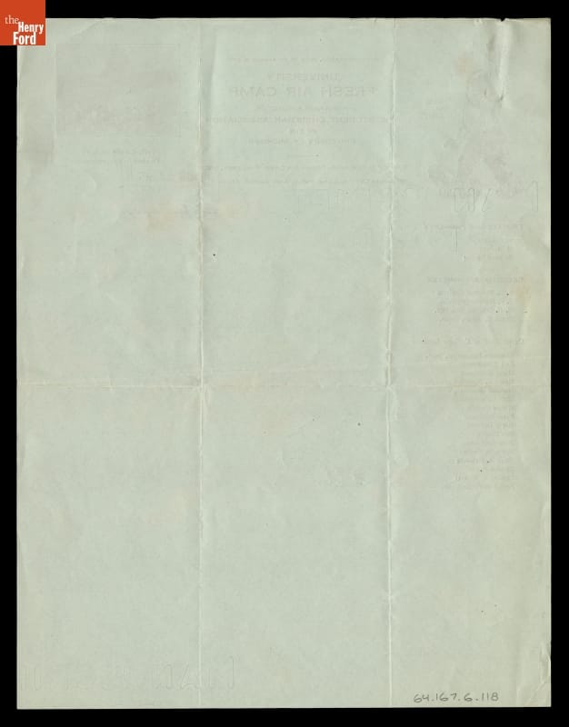 The Fresh Air Camp was founded in 1921 to provide a place for underprivileged boys to run, jump, swim, hike, and play outdoors. Members of the University of Michigan Student Christian Association established the camp with the support of generous benefactors, like Eleanor and Edsel Ford. Campers wrote letters to Mrs. Ford that recounted their experiences and showed their appreciation for her support.