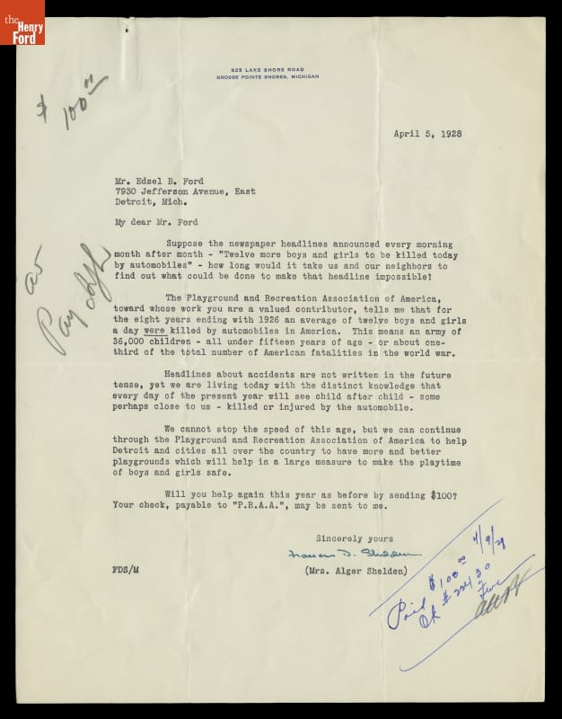 Letter from Frances D. Shelden, Playground and Recreation Association, to Edsel Ford, April 5, 1928