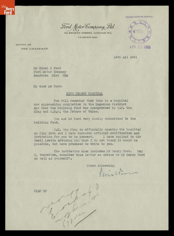 Letter from Percival Perry Inviting Edsel Ford to the Official Opening of King George Hospital, April 14, 1931