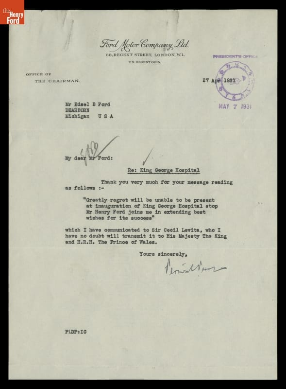 Letter of Thanks to Edsel Ford from Percival Perry regarding King George Hospital, April 27, 1931