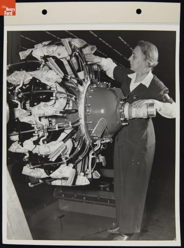 Mary E. Von Mach Inspects Pratt & Whitney Engines While Working at the Willow Run Bomber Plant, November 30, 1942