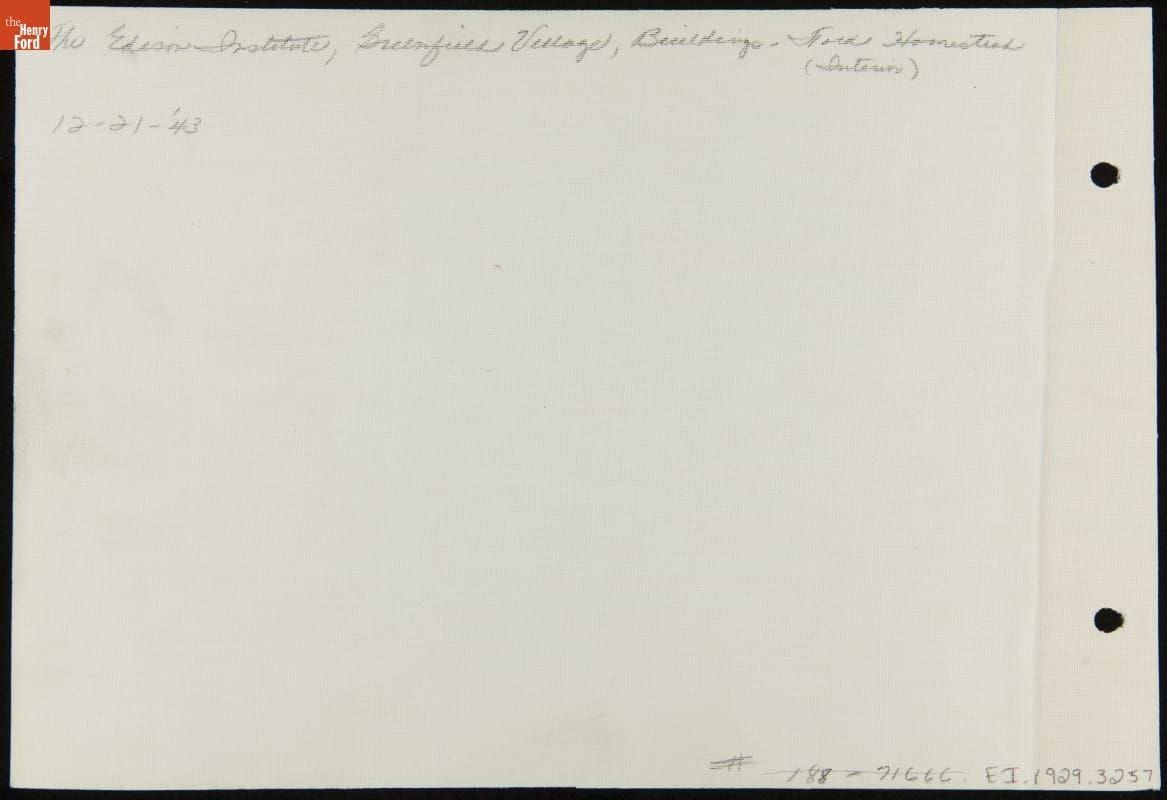 Henry Ford began restoration of his Dearborn, Michigan, birthplace in 1919. He repaired or replaced the farm buildings and filled the small, white clapboard house with original or similar furnishings he remembered from his boyhood. He dedicated the restoration to the memory of his beloved mother, Mary Litogot Ford, who died in 1876. In 1944, the house and outbuildings were moved to Greenfield Village.