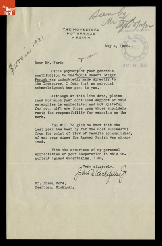Letter from John D. Rockefeller, Jr. to Edsel Ford regarding Mount Desert Parish Donation, May 4, 1932