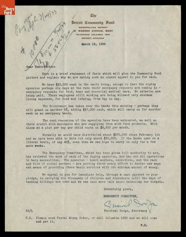 Letter from Percival Dodge to Edsel Ford regarding Donation to The Detroit Community Fund, March 15, 1933
