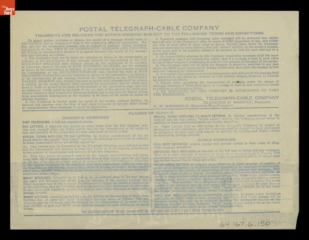Telegram sent by Edsel Ford by way of the Postal Telegraph-Cable Company.