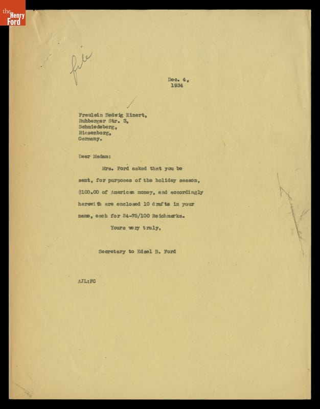 THF130700 / Letter to Hedwig Einert regarding a Donation, December 4, 1934