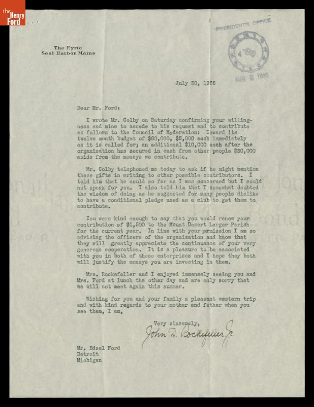 Letter from John D. Rockefeller, Jr. to Edsel Ford regarding Donations to Mount Desert Parish and Council for Moderation, July 30, 1935