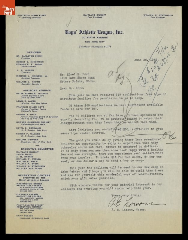 Letter from A.E. Larson, Boys' Athletic League, to Edsel Ford, June 25, 1936
