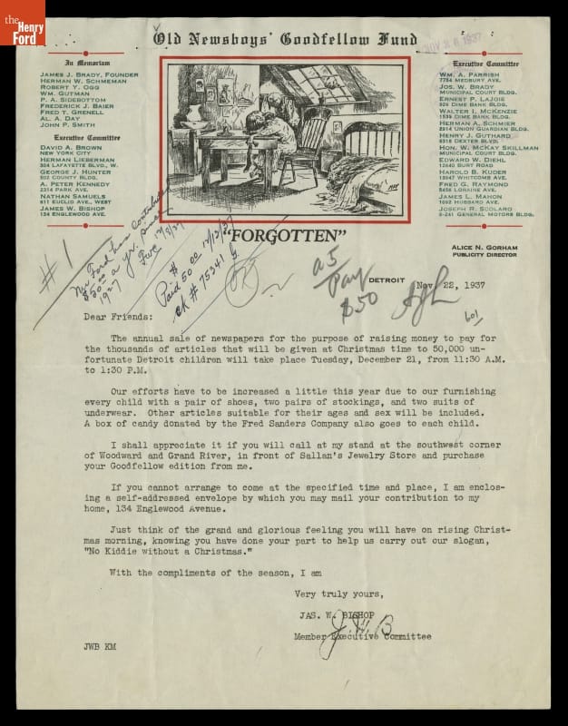 Fundraising Letter from James W. Bishop to Edsel Ford, for the Old Newsboys' Goodfellow Fund, November 22, 1937