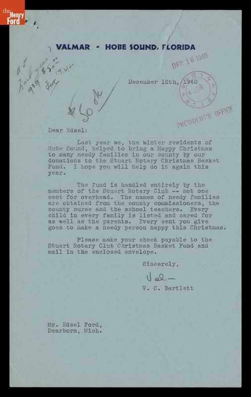 Fundraising Letter from V. C. Bartlett, Stuart Rotary Club Christmas Fund, to Edsel Ford, December 12, 1940