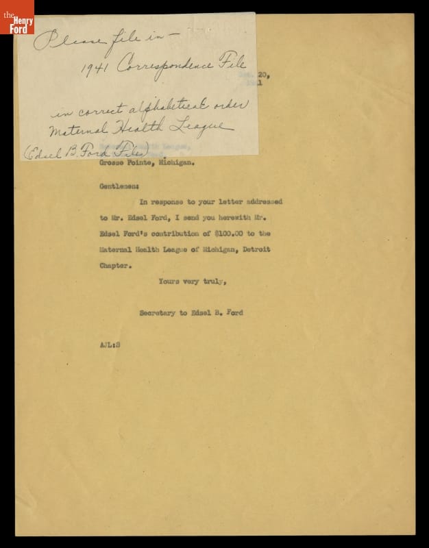 Letter from A. J. Lepine (for Edsel Ford) to the Maternal Health League of Michigan, October 20, 1941
