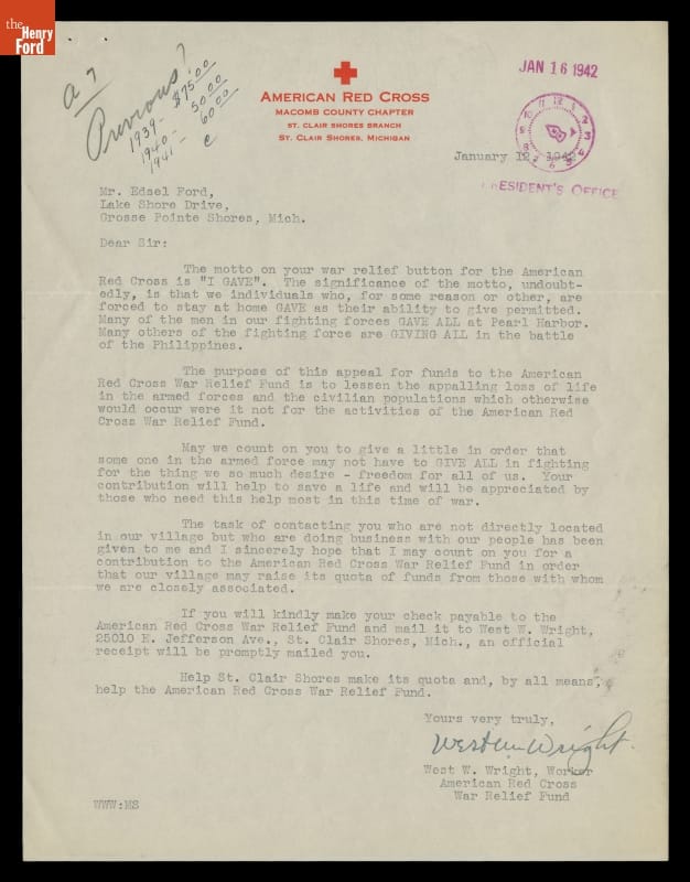 Fundraising Letter from West W. Wright, American Red Cross War Relief Fund, to Edsel Ford, January 12, 1942