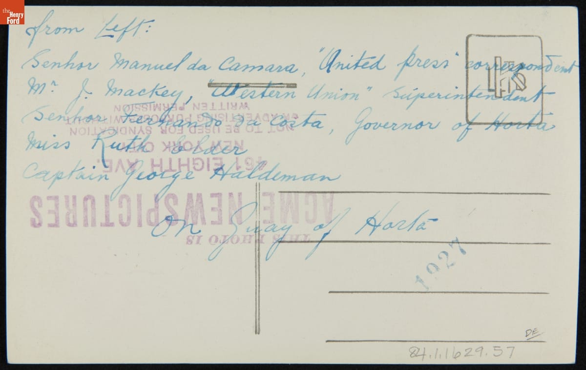 Ruth Elder, George Haldeman, Manuel da Camara, J. Mackey and Fernando da Costa, Horta, Azores, October 1927