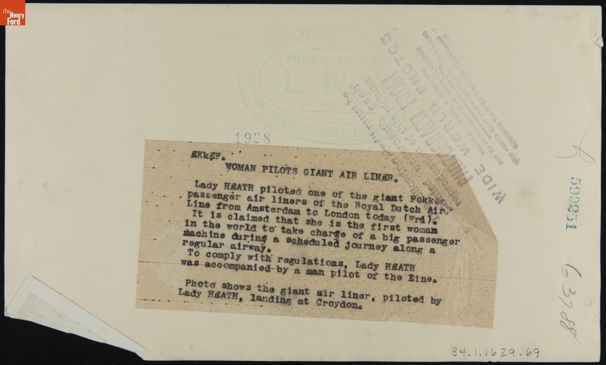 In 1927 Mary, Lady Heath, became the first woman in Ireland or Great Britain to earn a commercial pilot's license. It allowed her to fly passenger aircraft like the Royal Dutch airliner she is seen here landing at London's Croydon Airport. A 1929 crash in Cleveland impaired her health, and Lady Heath died from an apparent blood clot in 1939.