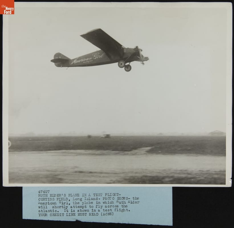 Ruth Elder planned to be the first woman to fly across the Atlantic. On October 11, 1927, Elder and co-pilot George Haldeman took off in their Stinson Detroiter American Girl. An oil leak forced them to ditch in the ocean some 360 miles short of land. Still, the 2,623 miles Elder covered set a new distance record for a female pilot.