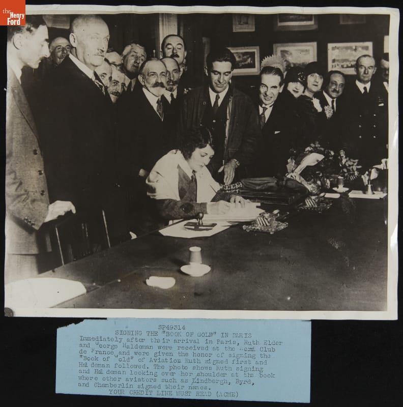 Ruth Elder Signing the Book of Gold with George Haldeman, Aero-Club de France, October 1927