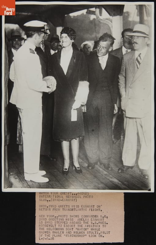 Amelia Earhart was congratulated by explorer Richard Byrd for her 1928 flight across the Atlantic Ocean. Earhart, riding as a passenger with pilot Wilmer Stultz and mechanic Louis Gordon, made the crossing in a Fokker F.VII Tri-Motor airplane. Byrd used a similar Fokker on his North Pole flight in 1926.