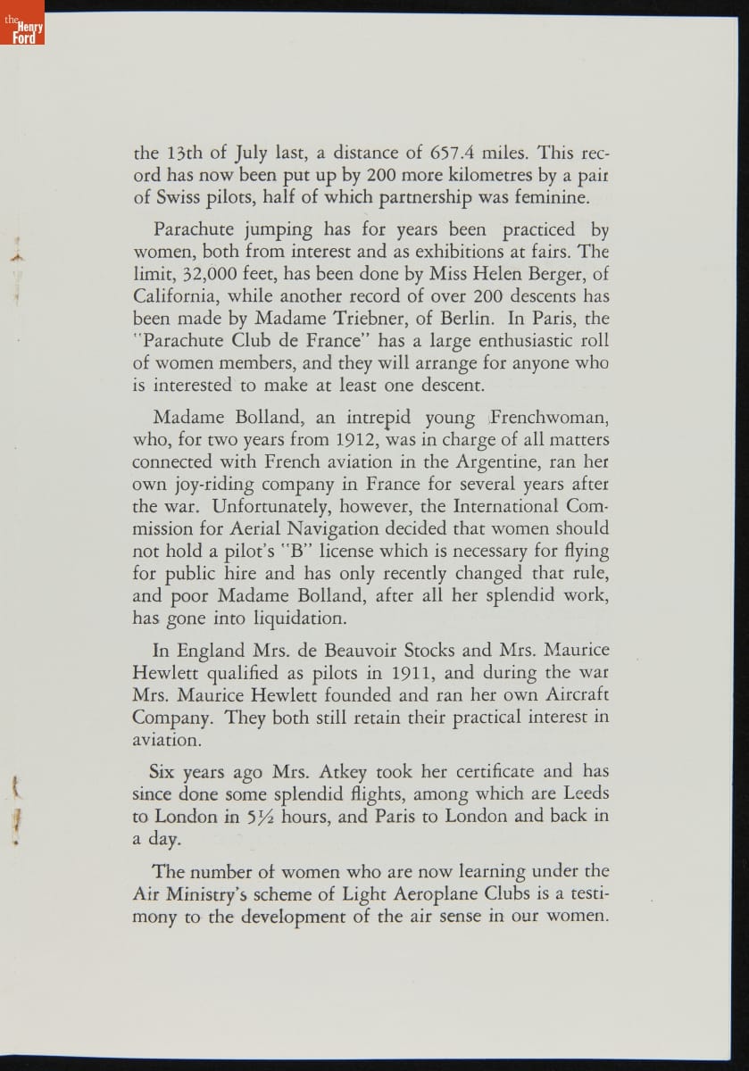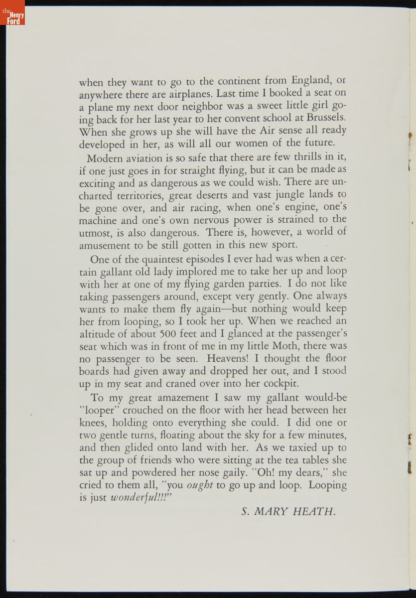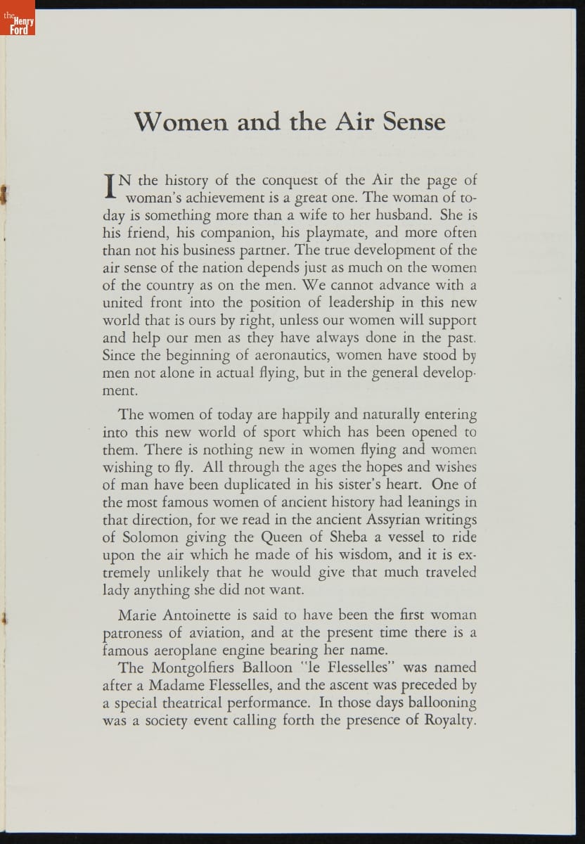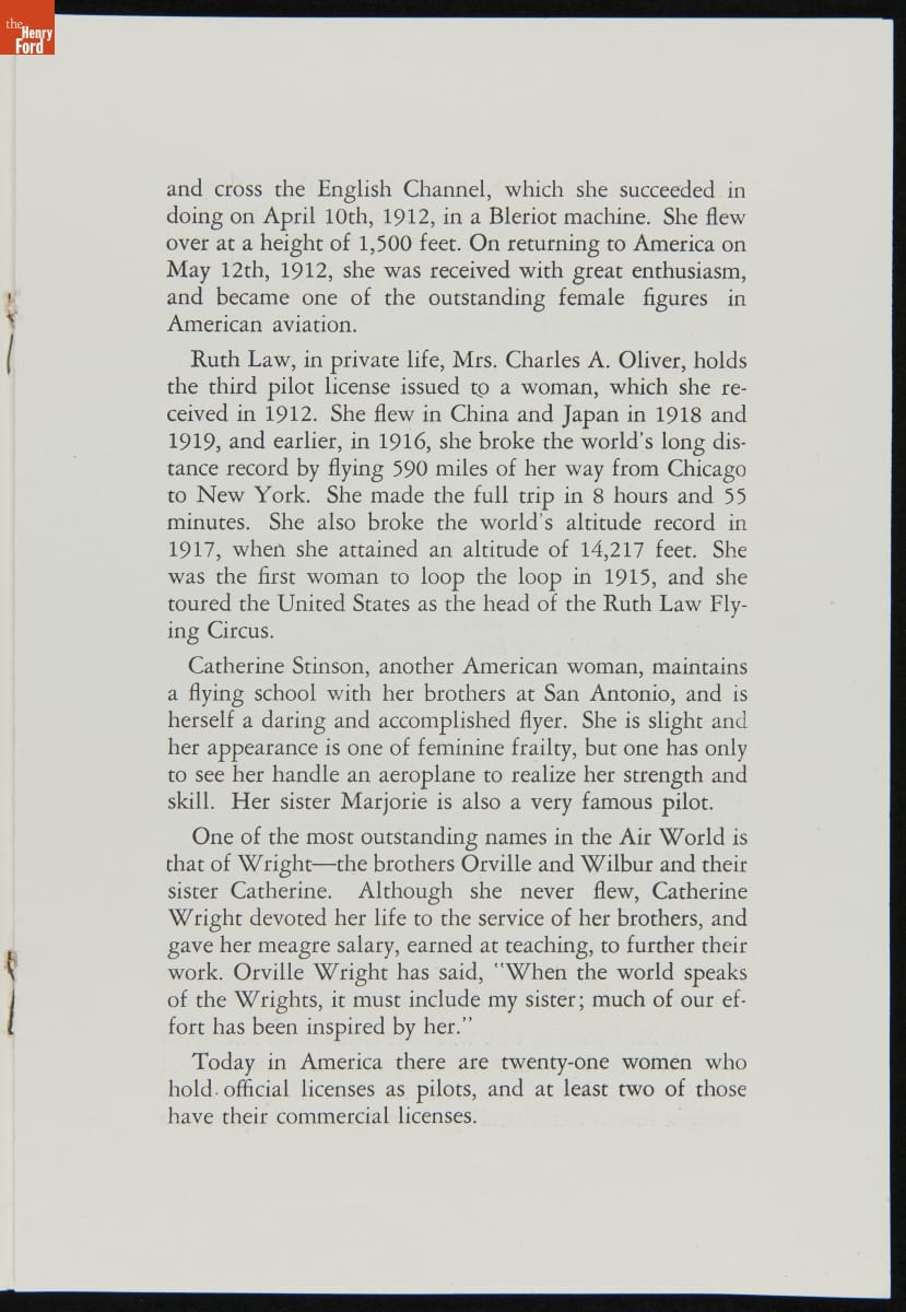 This booklet, written by Irish pilot Mary, Lady Heath, profiles some of the leading women in aviation through 1933. Those featured include Katharine Wright, Harriet Quimby, Katherine Stinson, Ruth Law, Phoebe Fairgrave Omlie, Elinor Smith, Maryse Bastie, and Amelia Earhart, among others. Each of these women made important contributions to flight during the airplane's first three decades.