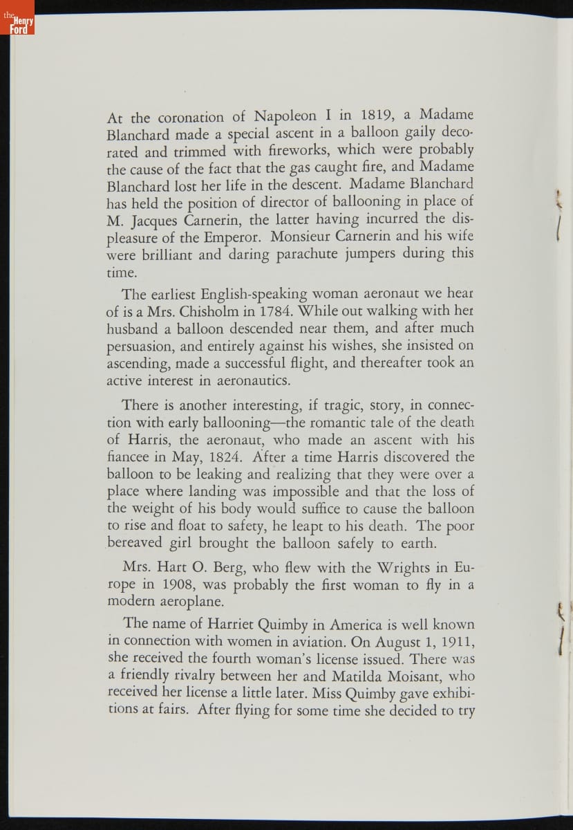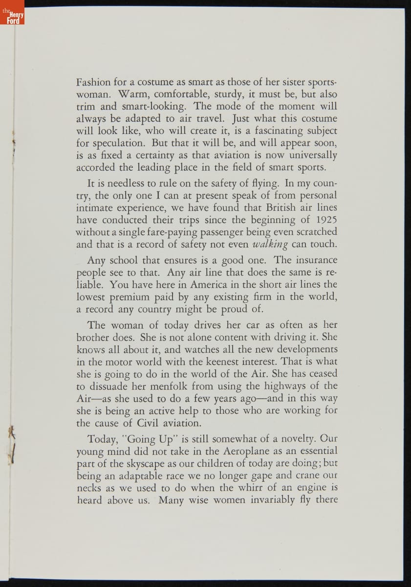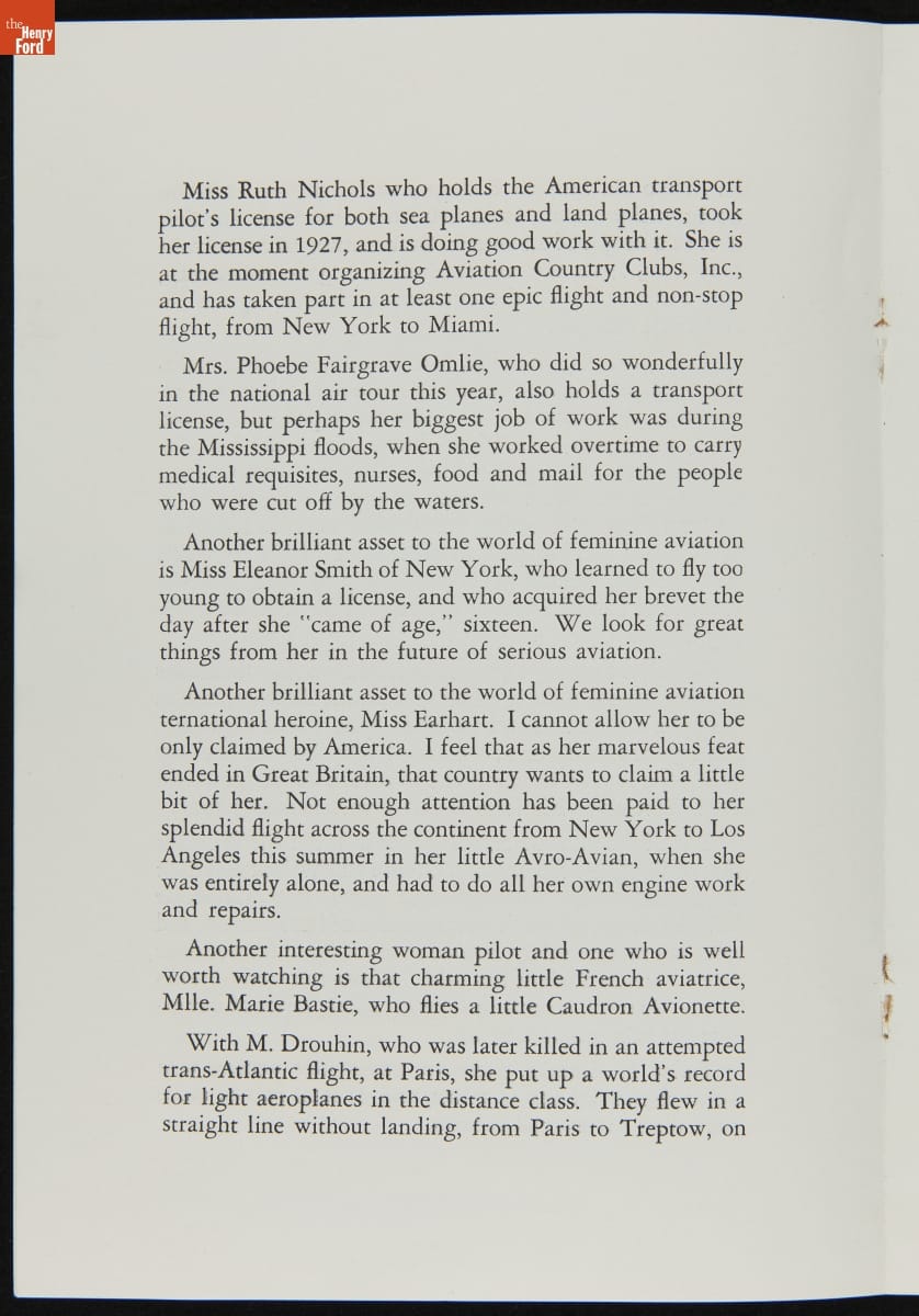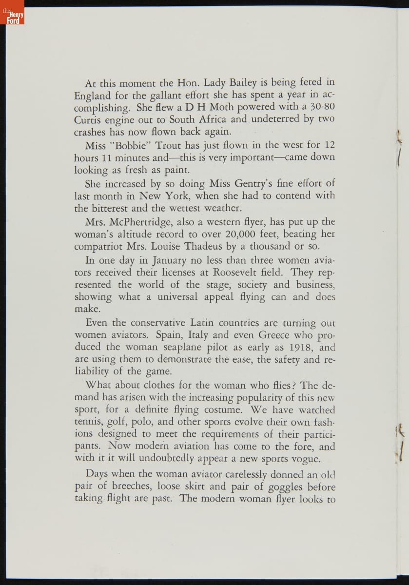 This booklet, written by Irish pilot Mary, Lady Heath, profiles some of the leading women in aviation through 1933. Those featured include Katharine Wright, Harriet Quimby, Katherine Stinson, Ruth Law, Phoebe Fairgrave Omlie, Elinor Smith, Maryse Bastie, and Amelia Earhart, among others. Each of these women made important contributions to flight during the airplane's first three decades.