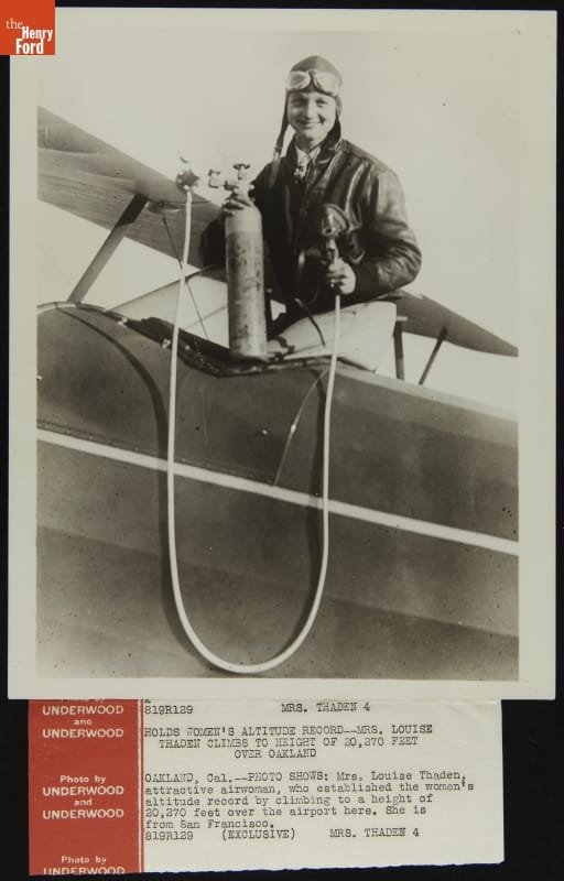 Louise Thaden earned her pilot's license in 1928 while working in sales for Travel Air Corporation. Thaden set the women's altitude record that December at 20,260 feet. She won the inaugural Women's Air Derby in 1929. At the 1936 Bendix Transcontinental Race -- the first in which women were allowed to compete against men -- Thaden and co-pilot Blanche Noyes took first place.