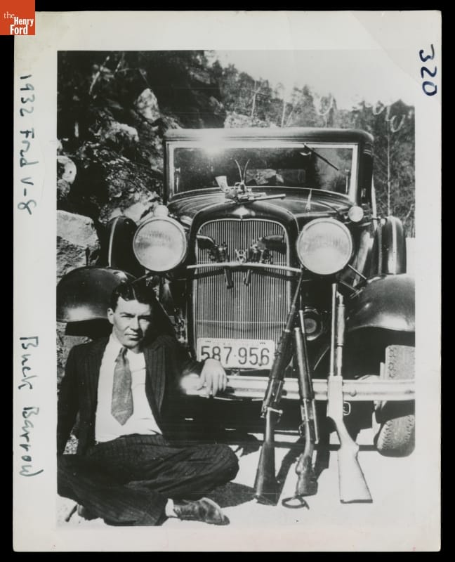 W.D. "Deacon" Jones Posing with Barrow Gang Stolen Weapons and 1932 Ford V-8