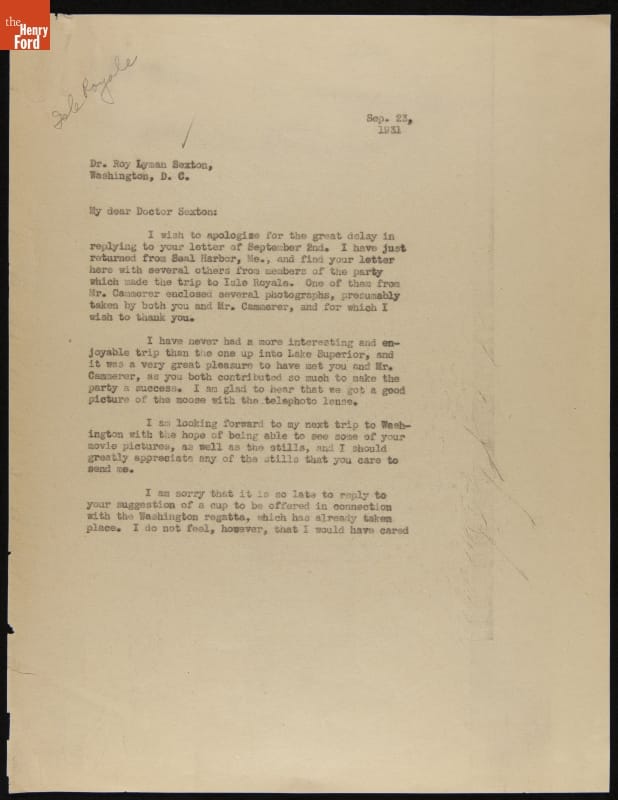 Letter from Edsel Ford to R. Lyman Sexton after a Visit to Isle Royale, Michigan, September 23, 1931