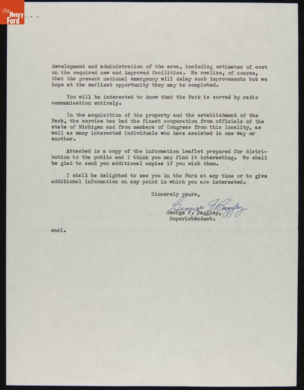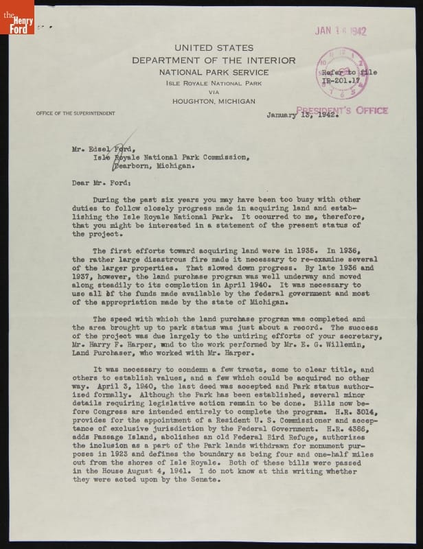 Letter from George Baggley to Edsel Ford Reporting on the Isle Royale National Park Project, January 13, 1942