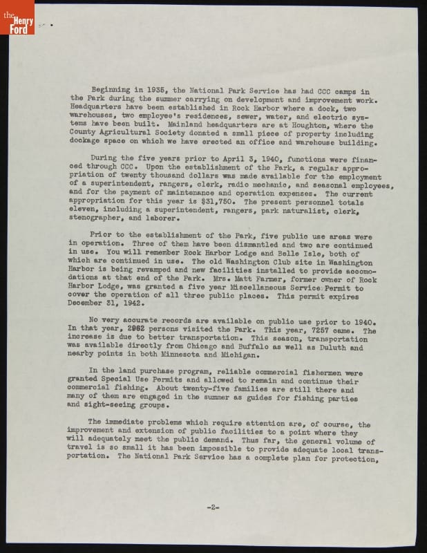 Congress authorized the creation of Isle Royale National Park in 1931. In order to establish the park, the Governor of Michigan appointed the Isle Royale National Park Commission, which included Edsel Ford, to handle land acquisition. By 1940, the Commission had acquired a majority of the island for the state who then transferred it over to the National Park Service.