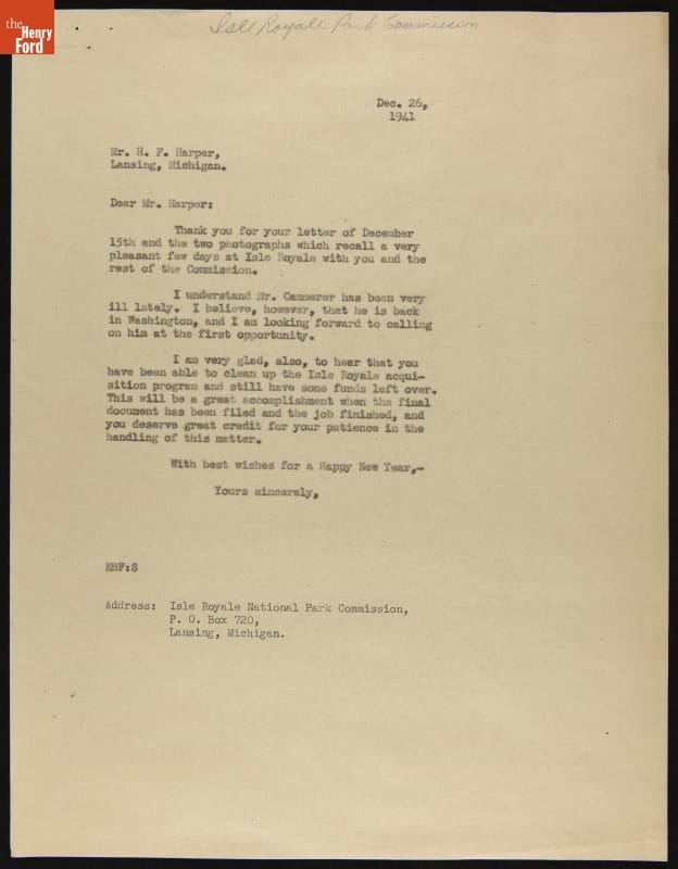 Letter from Edsel Ford to H. F. Harper regarding Isle Royale National Park Progress, December 26, 1941