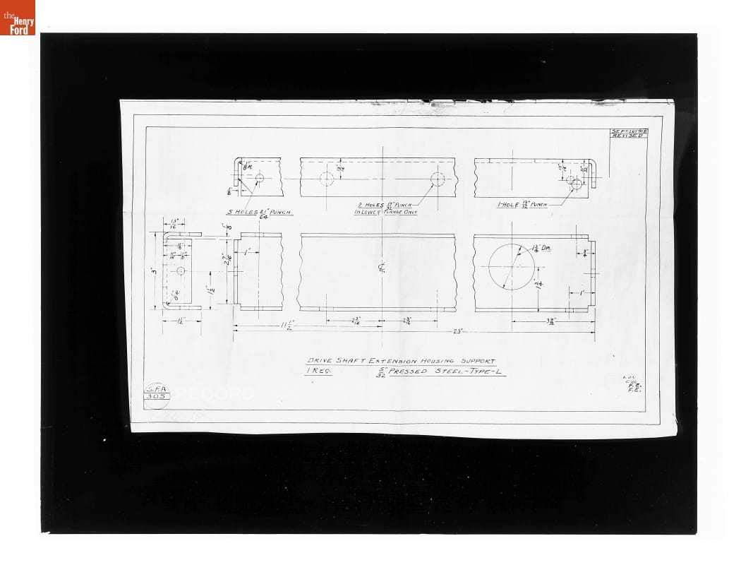 The Ford Motor Company created over a million parts drawings from 1903 to 1957. Many of these drawings specify engineering requirements for the components of Ford-made vehicles--including automobiles, trucks, tractors, military vehicles and Tri-motor airplanes. Others document assembly components, stages of casting and forging, or experimental designs. Beginning in the 1940s, Ford transferred the drawings to microfilm.
