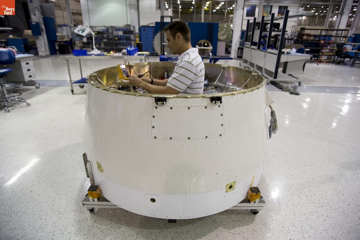 Elon Musk is the co-founder of PayPal and CEO of Tesla Motors and SpaceX. In 2008, staff from The Henry Ford journeyed to the California headquarters of SpaceX to interview the visionary entrepreneur. This image was one of many taken during the interview process documenting the employees, workspaces, and the factory where advanced rocket engines and spacecraft are made.