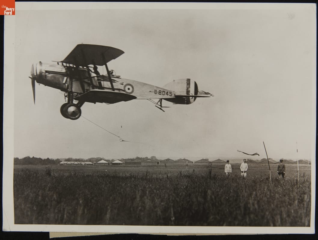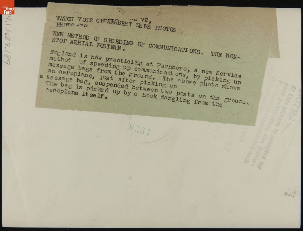 Air mail service was intended to speed up mail delivery. But landing an airplane to collect bags of mail slowed things down. Air mail operators in the United Kingdom experimented with nonstop pickup. A mail bag was suspended just off the ground between two posts and then snagged by a hook hanging from a passing plane.