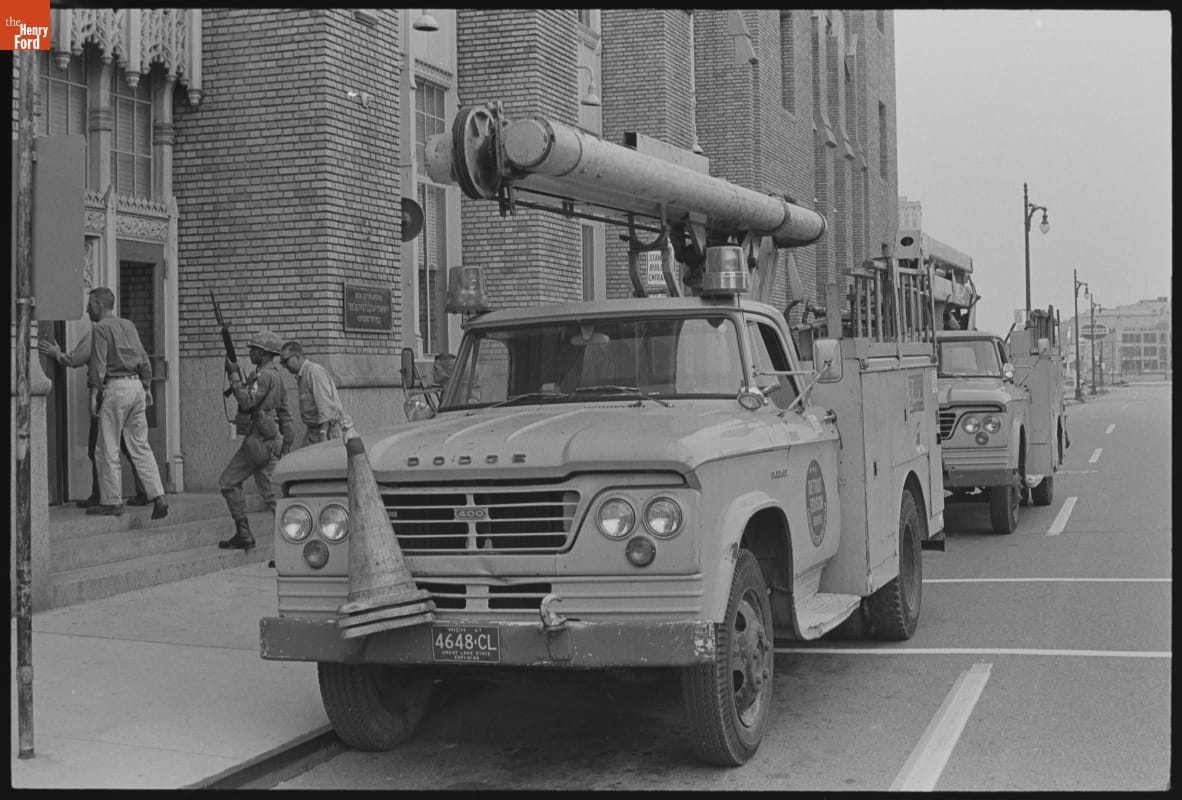 Throughout the 20th century, Detroit Edison photographers documented the company's work to develop and maintain the electrical infrastructure of Southeast Michigan. This image, part of a larger series, was taken immediately following the July 1967 Detroit Riot. Detroit Edison staff, accompanied by state and local officers and federal troops, inspected and repaired damaged lines after one of the era's largest episodes of civil unrest.