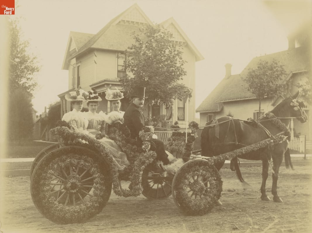 Community-sponsored celebrations provide entertainment for area residents. Around the turn of the 20th century, these celebrations sometimes included floral parades. Civic leaders would festoon buggies, coaches, carriages and even horses with flowers and ribbons. This photograph shows local store owner, E. G. Cook, and passengers in a decorated carriage ready to parade down the streets of Jackson, Michigan.