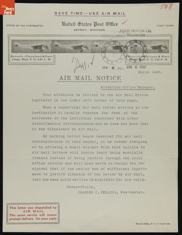 Letter from Detroit Postmaster Charles Kellogg Promotes the Use of Air Mail Notice Letterheads, March 1926