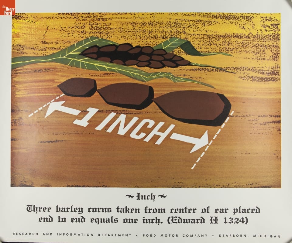 Inch / Three barley corns taken from center of ear placed / end to end equals one inch. (Edward II 1324) / RESEARCH AND INFORMATION DEPARTMENT, FORD MOTOR COMPANY, DEARBORN, MICHIGAN
