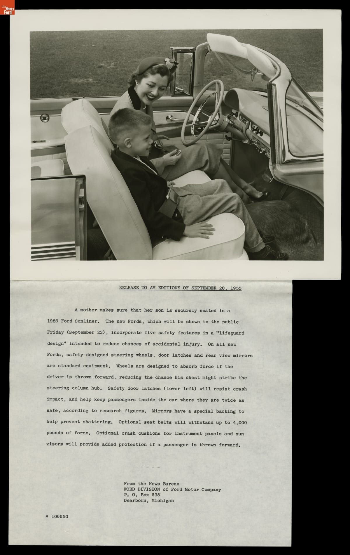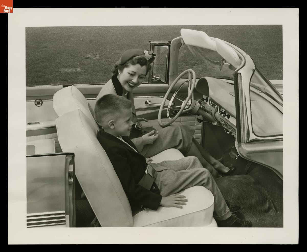 Mother and Son Demonstrating Safety Features of 1956 Ford Fairlane Sunliner Convertible, 1955
