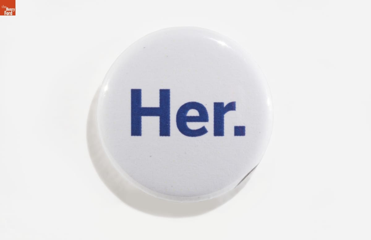 In 2016, Hillary Clinton became the first woman nominated by a major political party for President of the United States. Clinton recruited 45 artists and graphic designers for a project to create political buttons for her campaign. (She would have been the forty-fifth president if elected.) Roger Black, a graphic designer known for his works in major publications and on the web, designed this button.