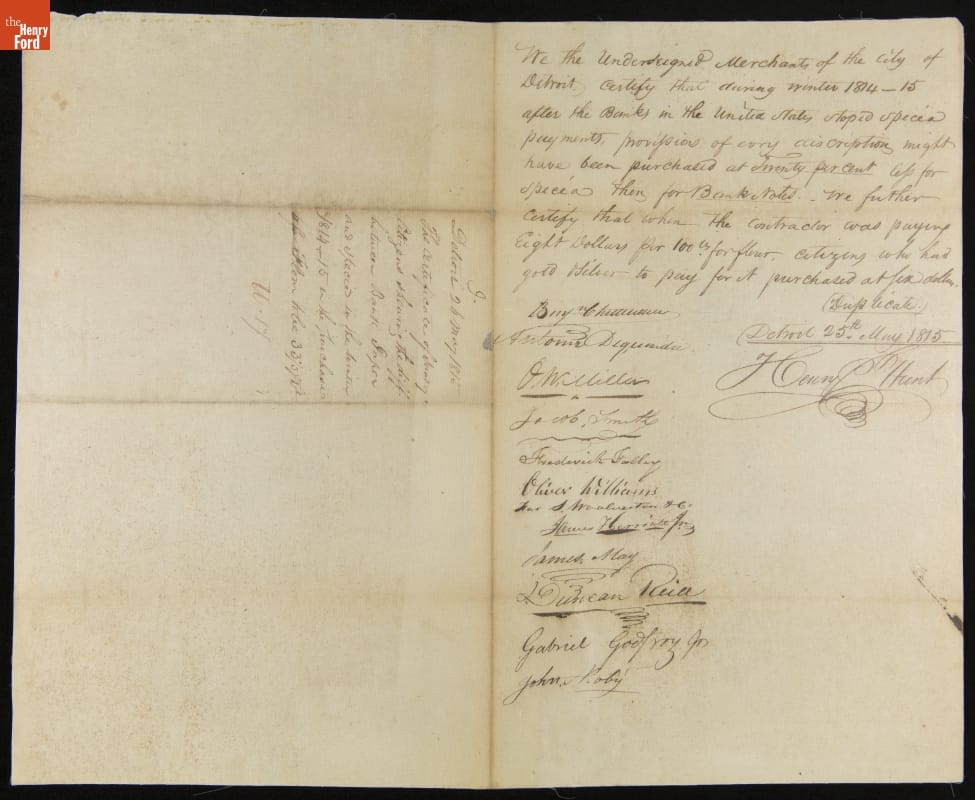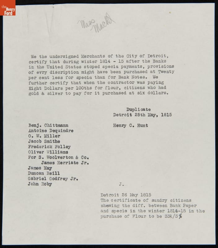 Complaint Filed by Detroit Merchants regarding the Value of Bank Notes and Specie during Winter 1814-1815