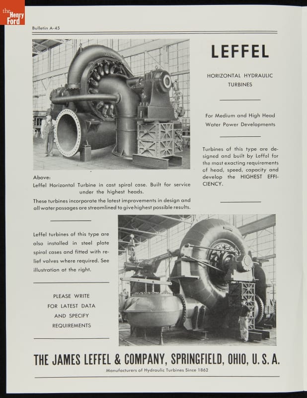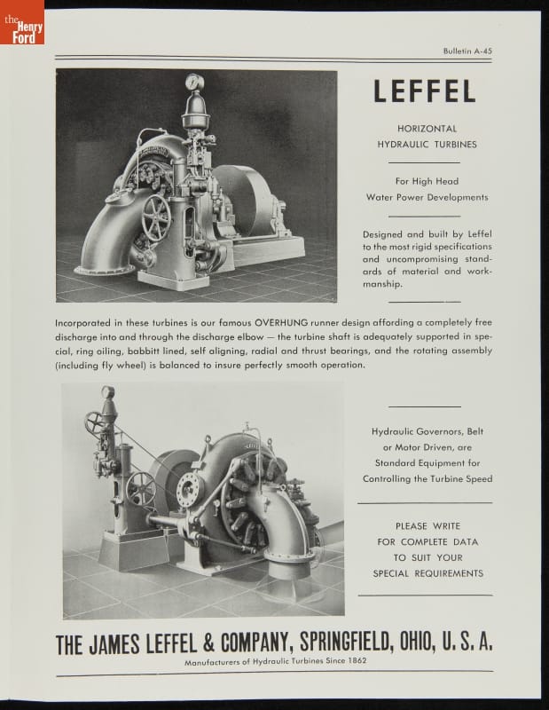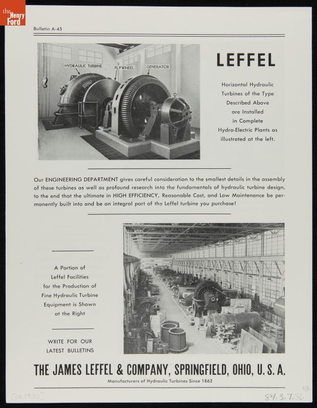 "Leffel Vertical Shaft Hydraulic Turbines. Bulletin A-45," circa 1930
