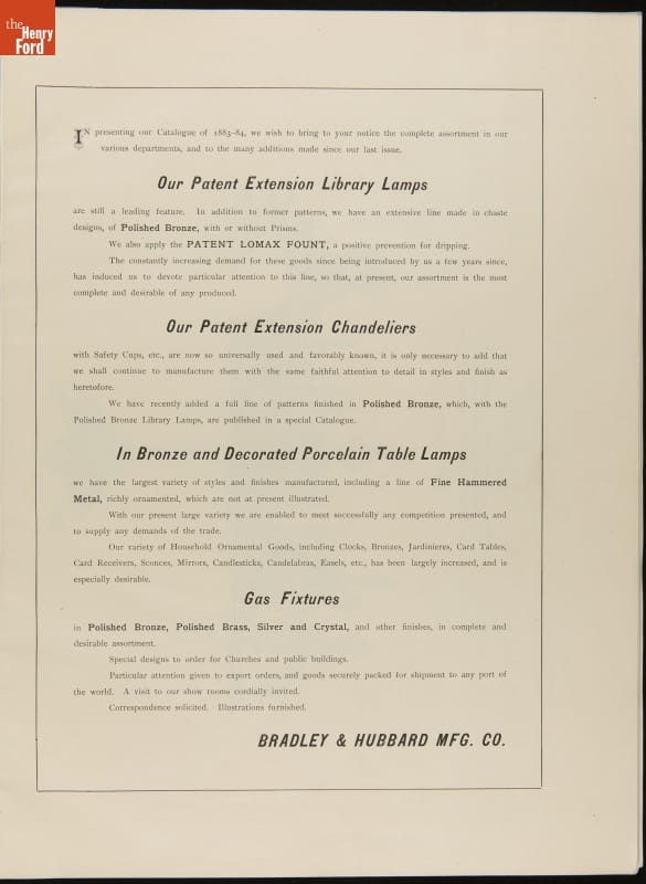 THF284153 / "Illustrated Catalogue of Kerosene Fixtures, Bronze Stand Lamps, Clocks, Call Bells, etc.," 1883-1884 / preface