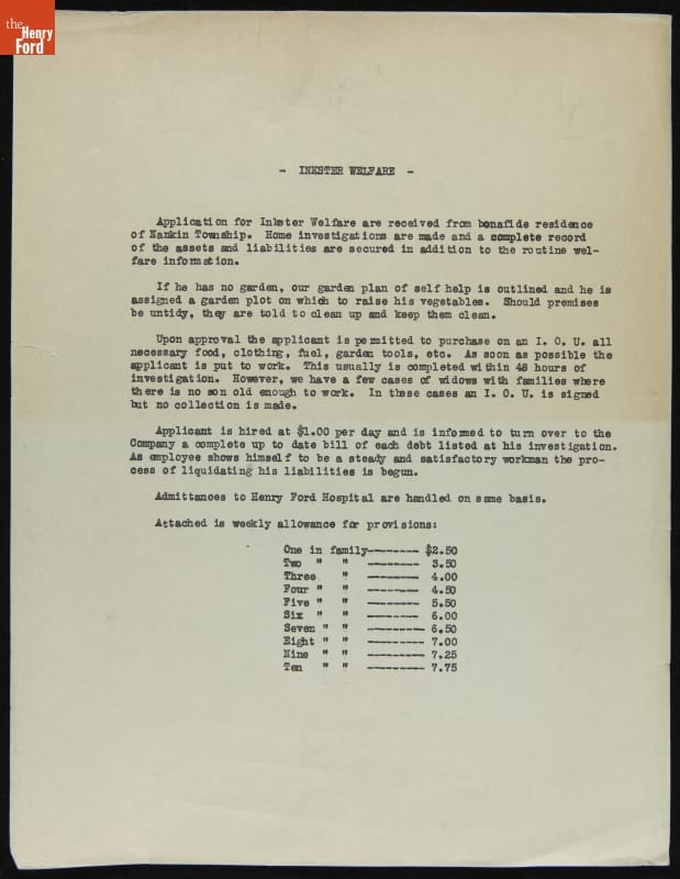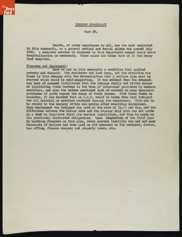 During the Great Depression, Ford Motor Company made efforts to improve living conditions in Inkster, Michigan, a primarily Black community hit especially hard by the economic crisis. Ford repaired homes, paved streets, established a medical clinic, and opened a low-price commissary. Improvements were funded through involuntary paycheck deductions from Inkster residents employed at Ford's nearby Rouge plant.