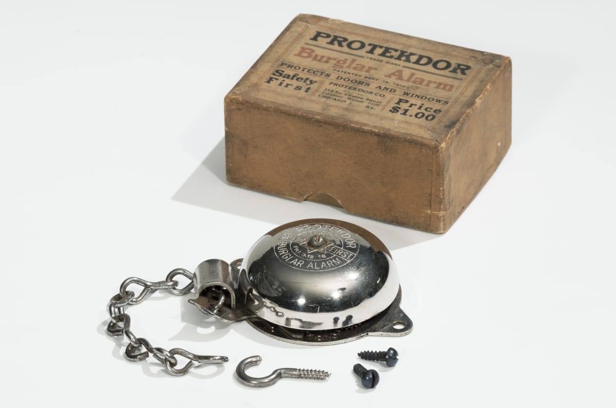 PROTEKDOR / TRADE MARK / Burglar Alarm / PATENTED SEPT. 12, 1916 / PROTECTS DOORS AND WINDOWS / Safety First / PROTEKDOR CO. / NO INC. / 313 So. Clinton Street / Telephone Wabash 7109 / CHICAGO - - ILL. / Price $1.00