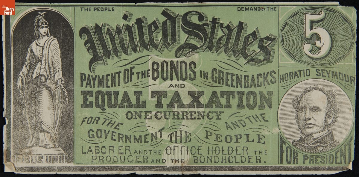 THE PEOPLE DF THE UNITED STATES DEMAND PAYMENT OF THE BONDS IN GREENBACKS AND EQUAL TAXATION / ONE CURRENCY FOR THE GOVERNMENT AND THE PEOPLE LABORER AND THE OFFICE HOLDER THE PRODUCER AND THE BONDHOLDER. / HORATIO SEYMOUR FOR PRESIDENT