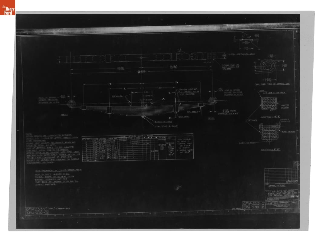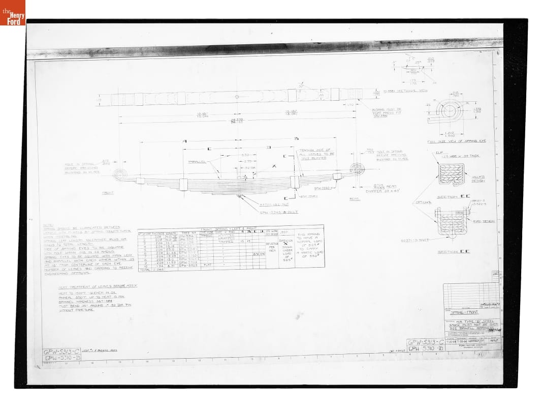 The Ford Motor Company created over a million parts drawings from 1903 to 1957. Many of these drawings specify engineering requirements for the components of Ford-made vehicles--including automobiles, trucks, tractors, military vehicles and Tri-motor airplanes. Others document assembly components, stages of casting and forging, or experimental designs. Beginning in the 1940s, Ford transferred the drawings to microfilm.