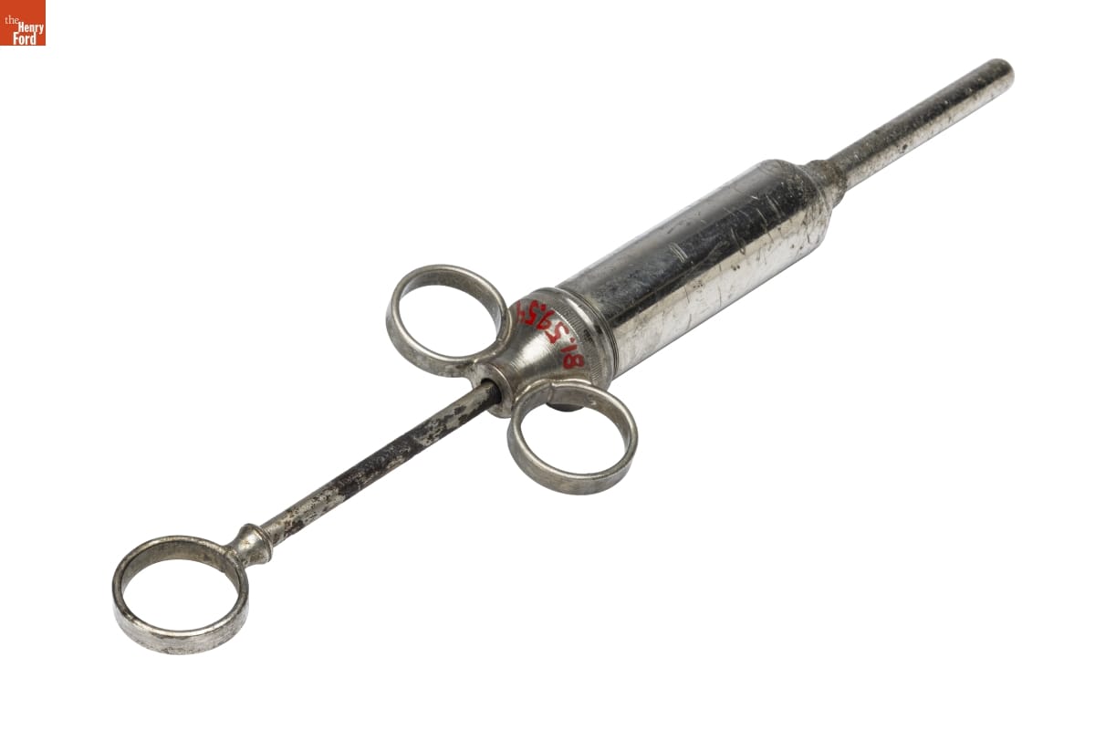 Veterinarians use dose syringes to dispense a specific quantity of medicine. This syringe injects medicine orally into an animal's mouth -- unlike syringes that use a needle to inject medicine intravenously into the bloodstream. Dose syringes like this one, made of metal, were not disposable and had to be sterilized between uses.