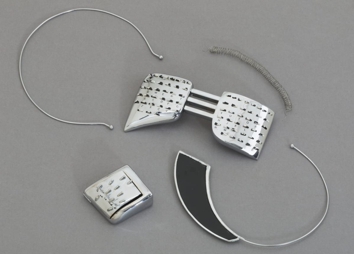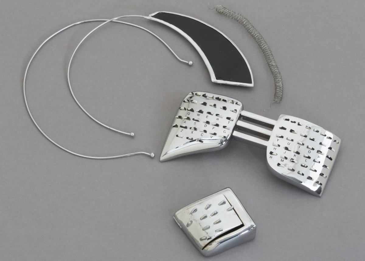 The Walking Office Wearable Computer is a prototype model created by the design group Salotto Dinamico. This proposed device subverted where (and when) the office could be, turning the human body into a mobile workstation. A keyboard, display arc, and cassette recorder became personal adornment--also capable of pairing with an acoustic modem to exchange data through telephone lines.